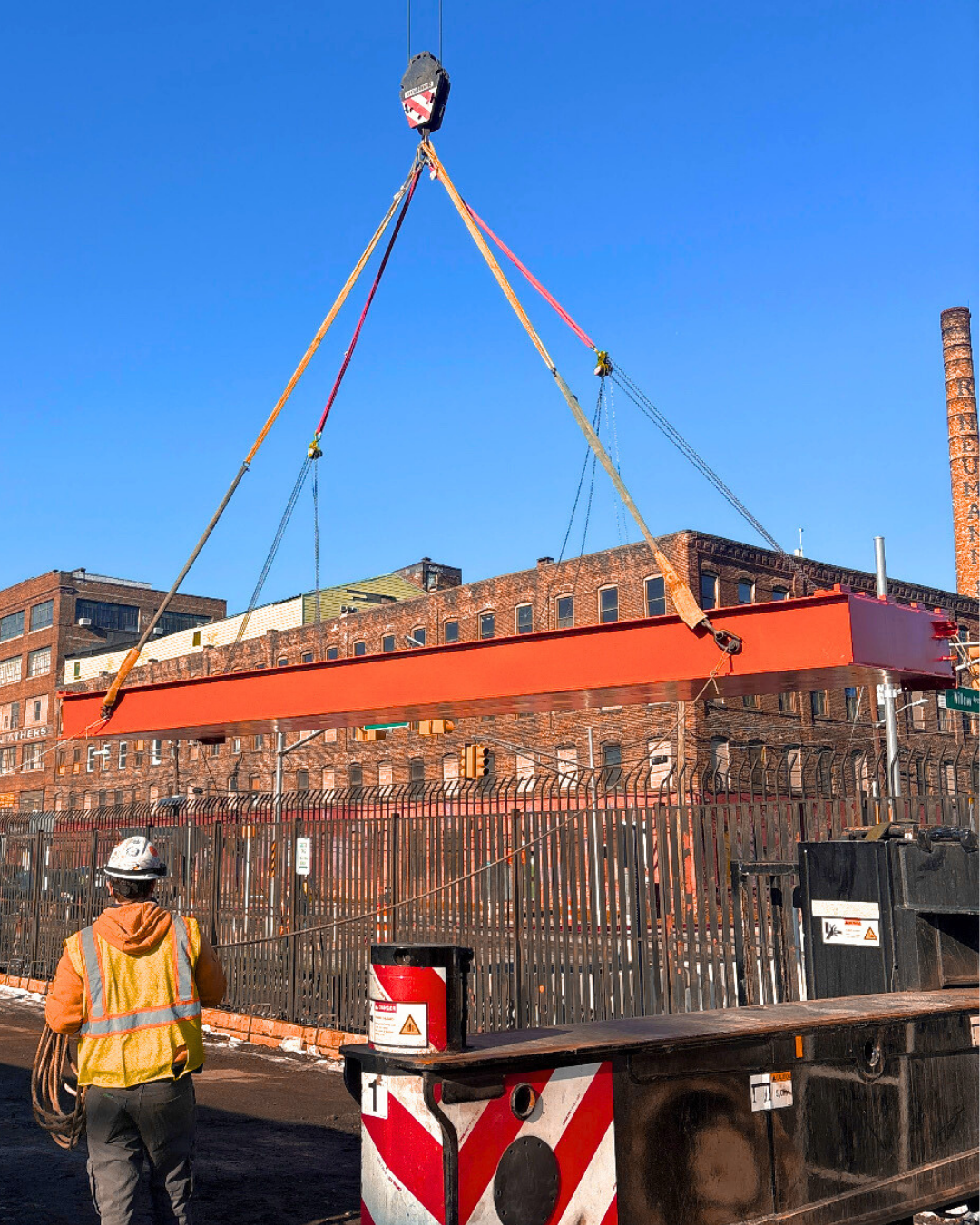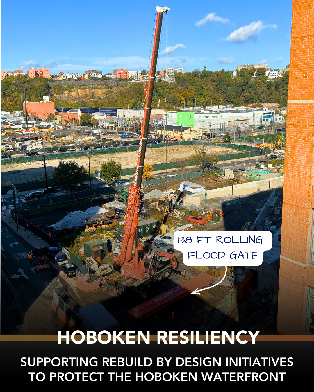 Orange Flood Control, LLC collaborated directly with the New Jersey Department of Environmental Protection (NJDEP) to furnish 27 flood gates across the North & South zones of Hoboken. Our solution-driven team supported precision crane operations, rigging logistics, lift coordination, equipment mobilization, and device offloading – safely placing a 138FT sliding flood gate in Hoboken’s tight, densely-populated Northern end. This coordination plays a direct role in securing Hoboken’s businesses, waterfront neighborhoods, parks/recreation spaces, and growing economy.